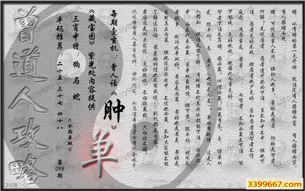 098期藏寶圖 新:寸肠争奈此情何 老:请看床头金字经 禁:鼠 禁:3尾 玄機字:《肿》