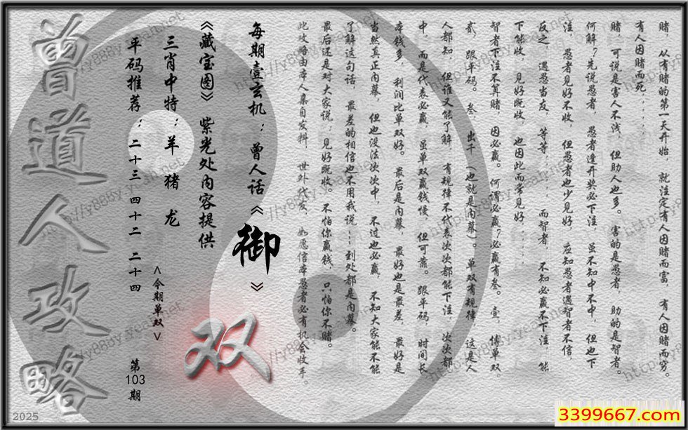 103期藏寶圖 新:花鲜绚日猩红妒 老:闻道潮头壹丈高 禁:蛇 禁:9尾 玄機字:《卸》