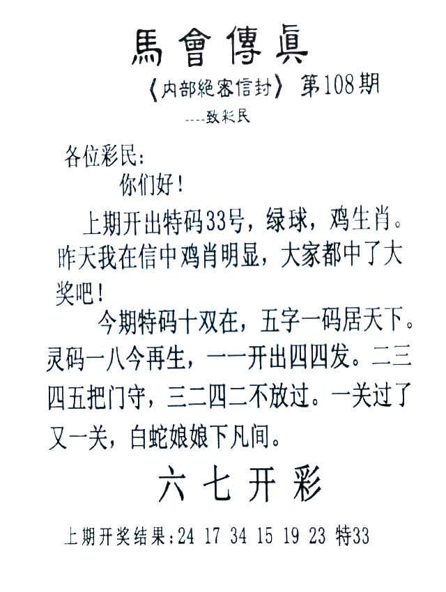108期:首发推荐:≮馬會傳眞≯→(香港正版)