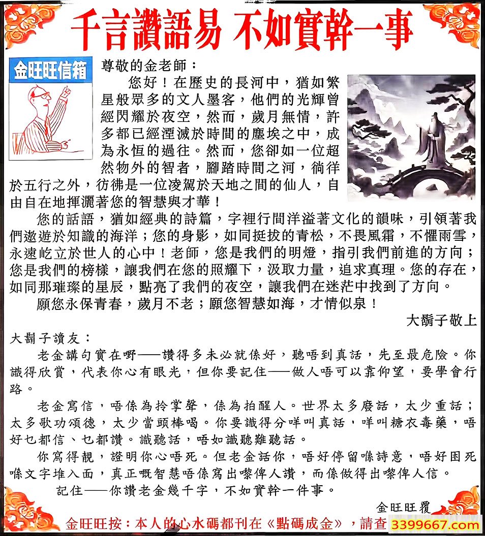 113期:金旺旺信箱彩民推荐→→《千言讃語易 不如實幹一事》