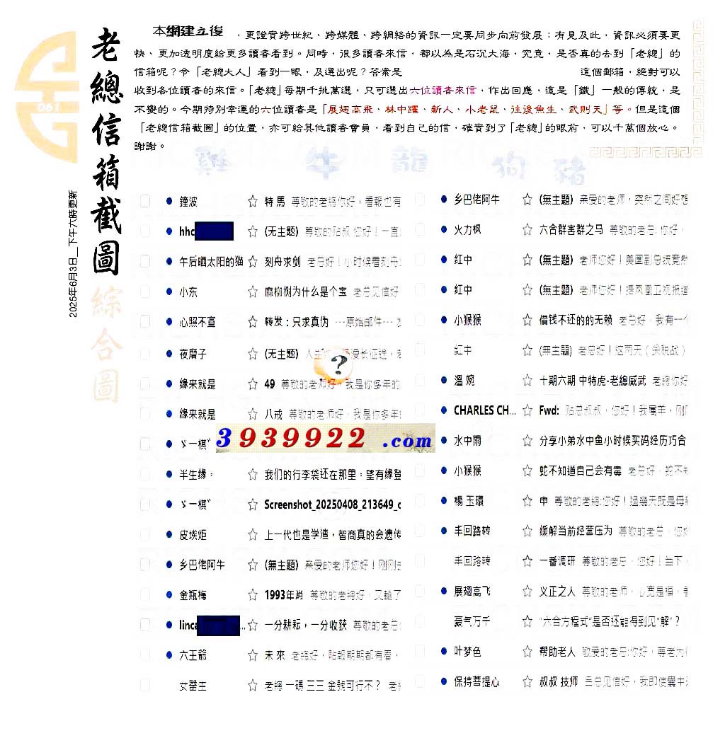 主题 :061期:六合皇金句/老总论码/萧公子/林大师/五行夺码/老总信箱截