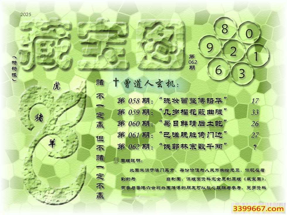 | 主题 :062期藏寶圖 新:饯郭林宗数千两 老:风微烟淡雨箫然 禁:猴 禁:5尾 |