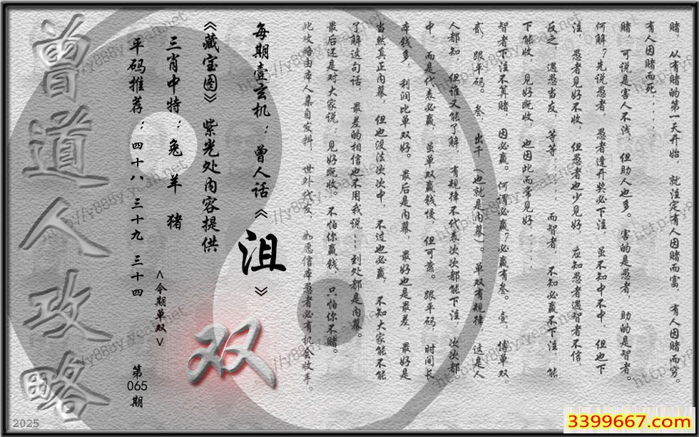 | 主题 :065期藏寶圖 新:障车儿郎且须缩 老:善恶到头终有报 禁:鸡 禁:1尾 |