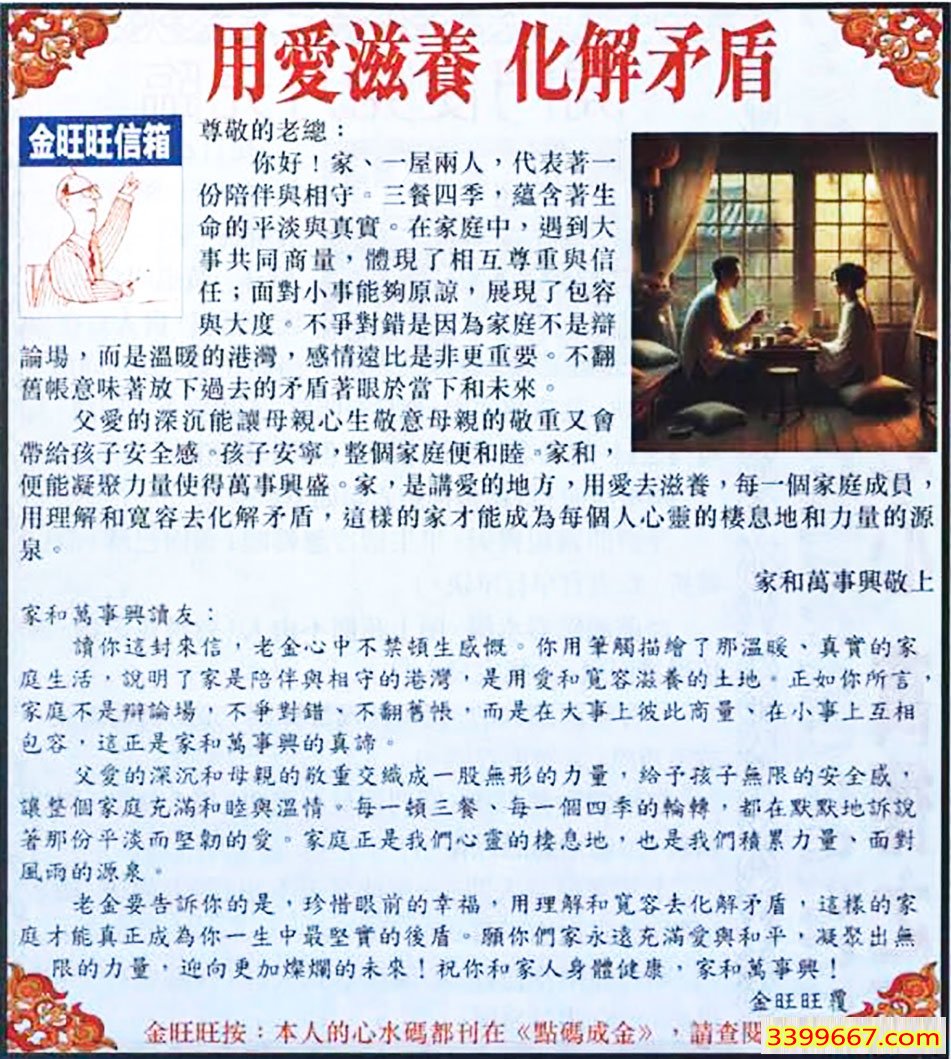 | 主题 :072期:金旺旺信箱彩民推荐→→《用愛滋養 化解矛盾》 |