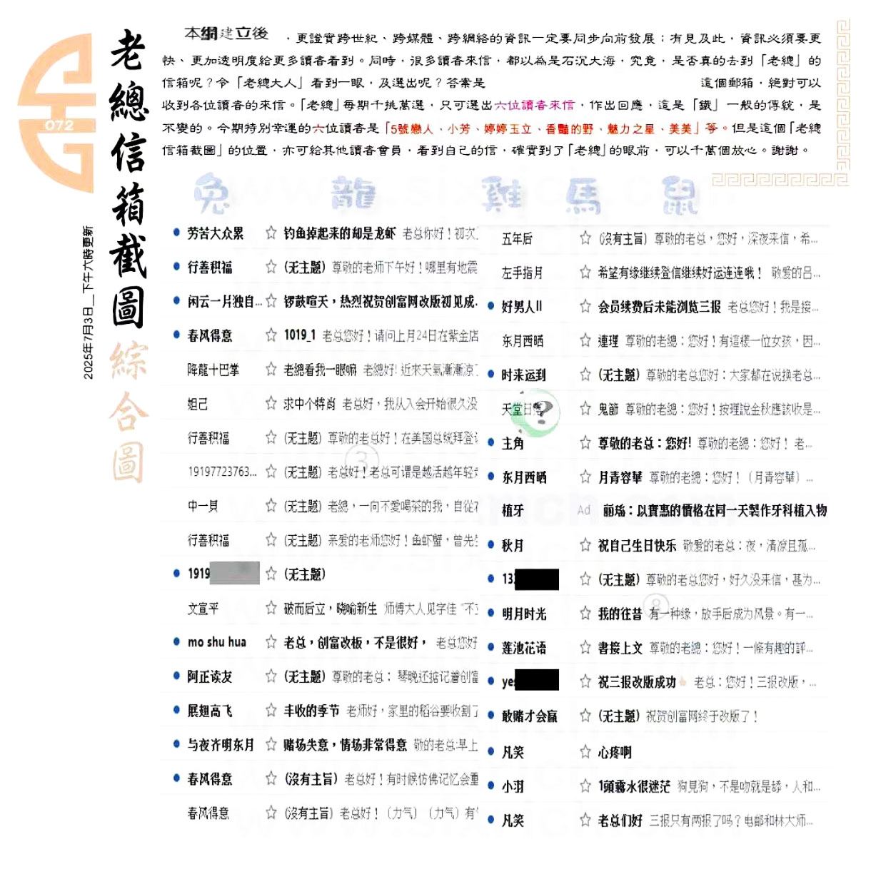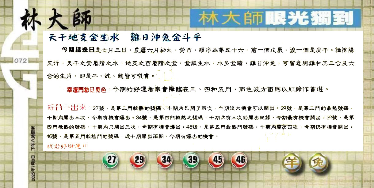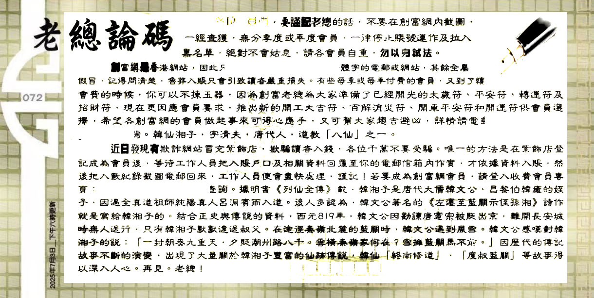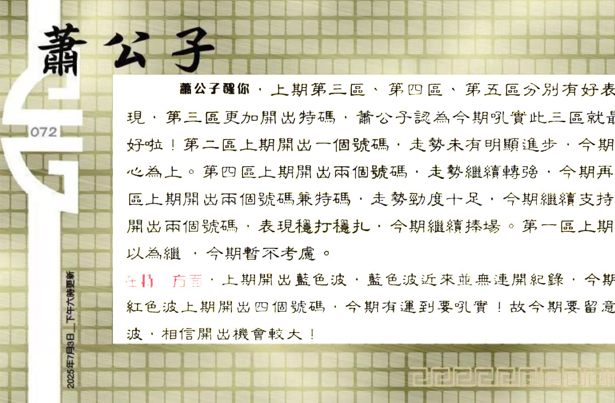 | 主题 :072期:六合皇金句/老总论码/萧公子/林大师/五行夺码/老总信箱截 |