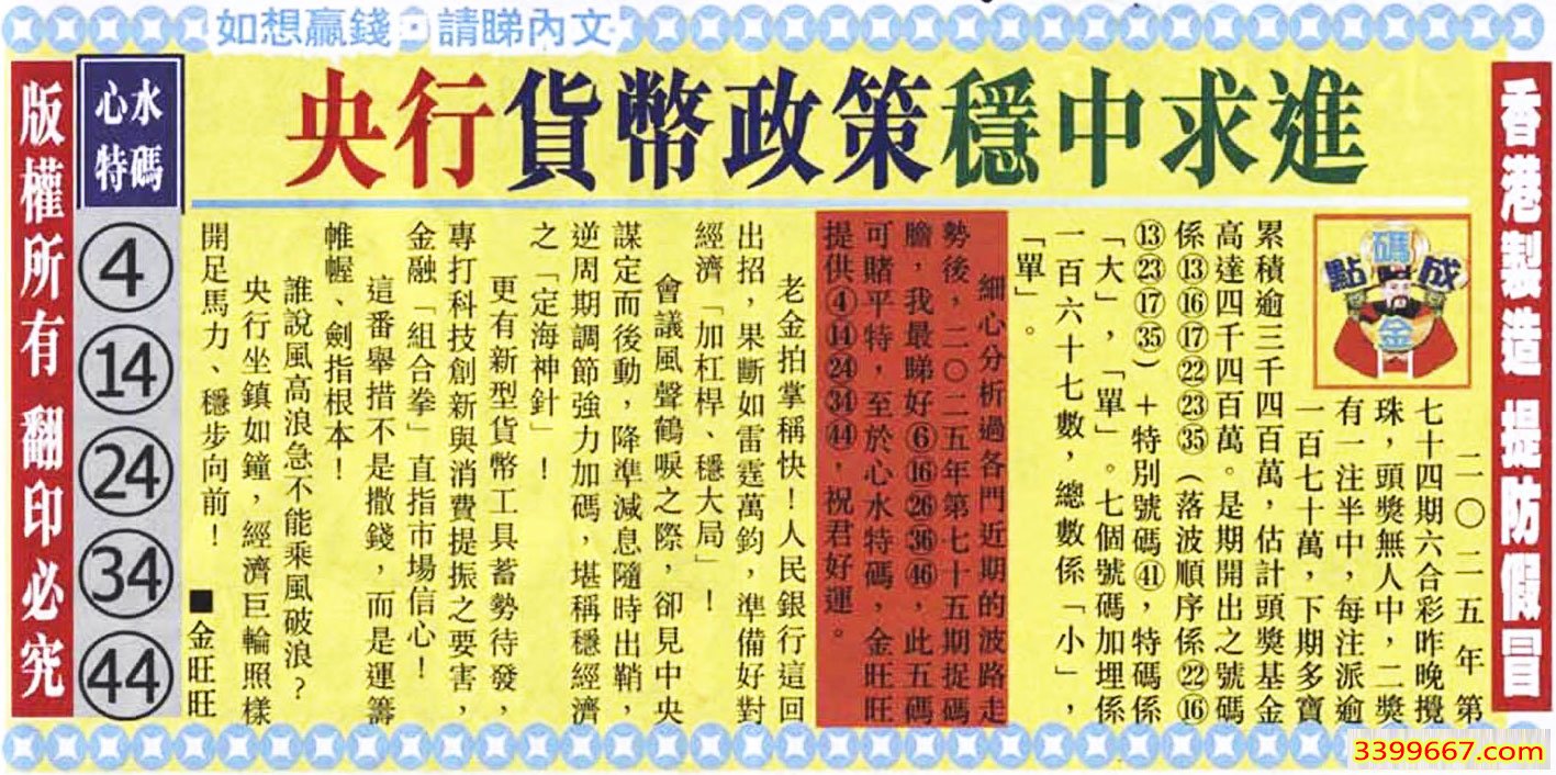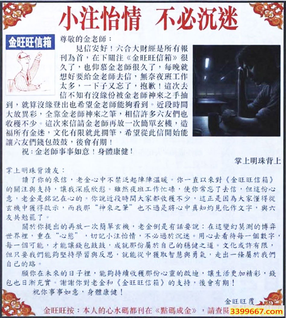 | 主题 :075期:金旺旺信箱彩民推荐→→《小注怡情 不必沉迷》 |