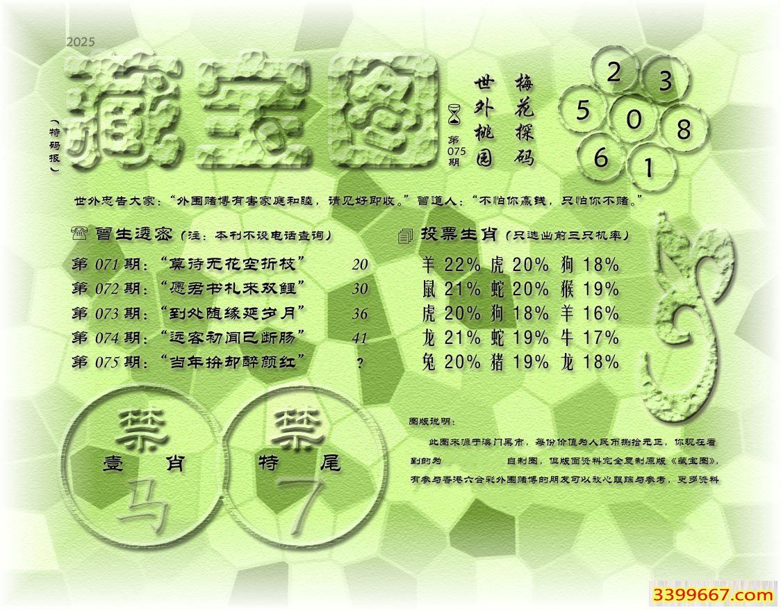 | 主题 :075期藏寶圖 新:余霞收尽寒烟绿 老:当年拼却醉红颜 禁:马 禁:7尾 |