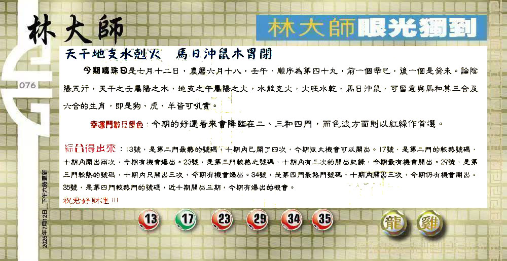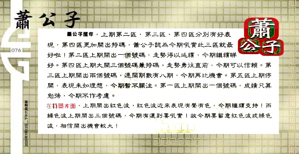 | 主题 :076期:六合皇金句/老总论码/萧公子/林大师/五行夺码/老总信箱截 |