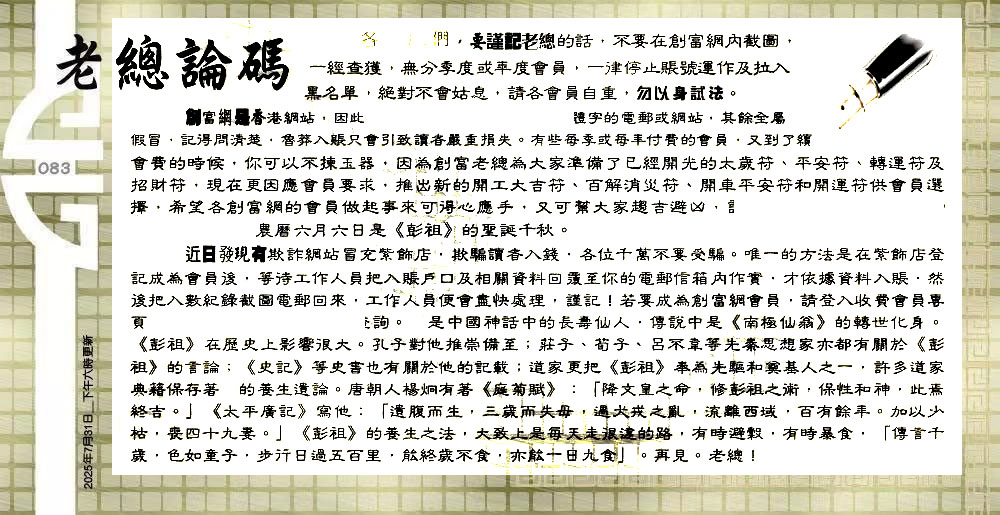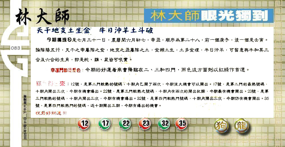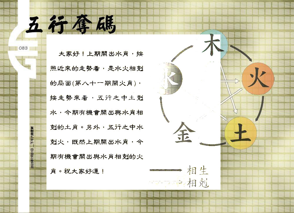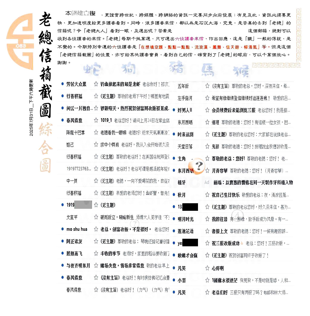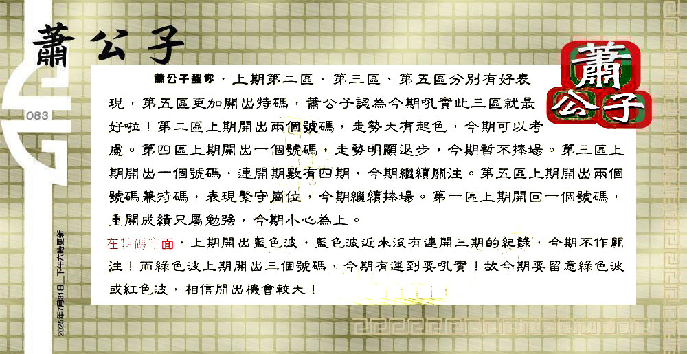 | 主题 :083期:六合皇金句/老总论码/萧公子/林大师/五行夺码/老总信箱截 |